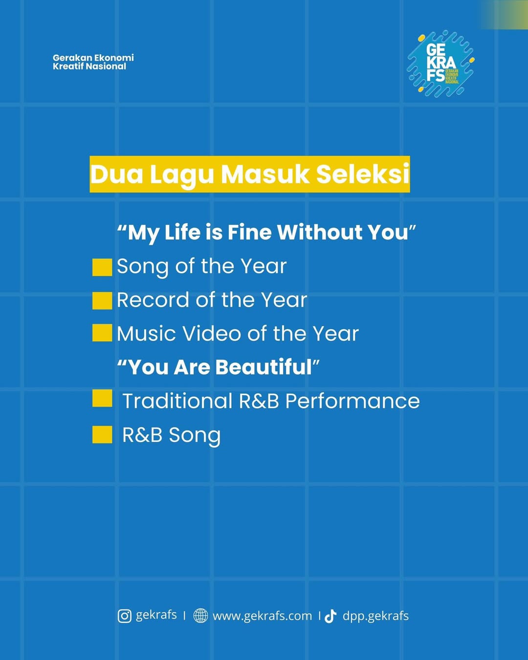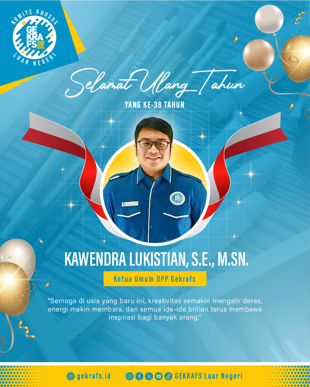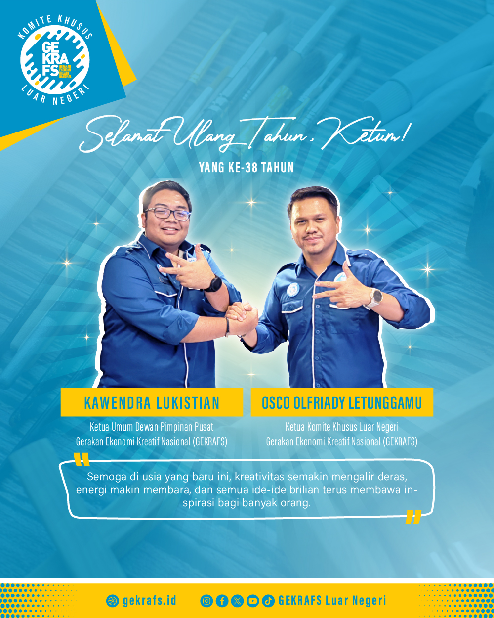 Sebagai garda terdepan dalam mendukung, mempromosikan, dan melindungi ekonomi kreatif, Gekrafs membawa harapan dan inspirasi bagi ribuan individu yang memajukan kekayaan budaya, seni dan inovasi di Indonesia, sehingga turut mengantarkan bangsa ini menuju cita-cita besar "Indonesia Emas 2045".